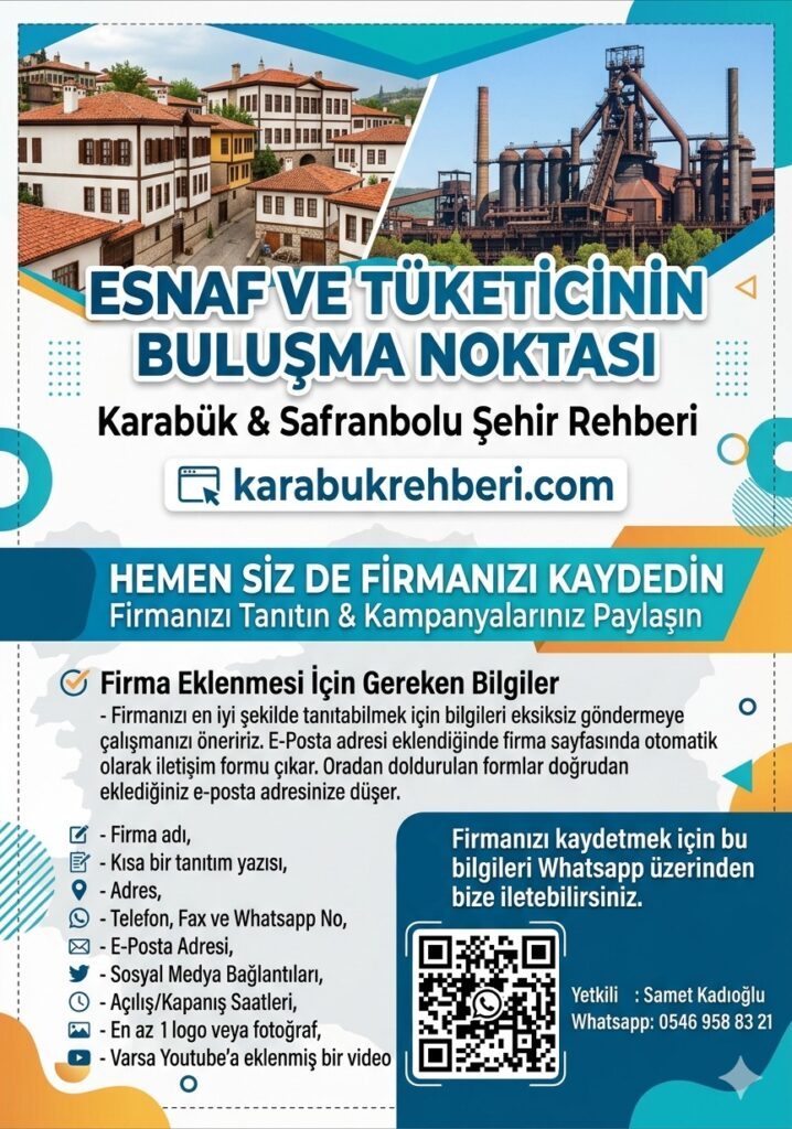 Siz de firmanızı Karabük Rehberi‘ne kaydetmek istiyorsanız bize Whatsapp yoluyla ulaşabilirsiniz.